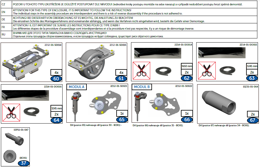 Der Bausatz zum Erhöhen der Module beinhaltet zusätzliche Teile, um die Terrassenabdeckung um 20 cm zu erhöhen. Hierbei müssen Sie u.a. die Radträger in den Profilen austauschen und anstelle der Dichtungen die Bürsten anbringen, bevor Sie die Unterkonstruktion zusammenbauen. Befolgen Sie beim Zusammenbau die Angaben in der Aufbauanleitung.