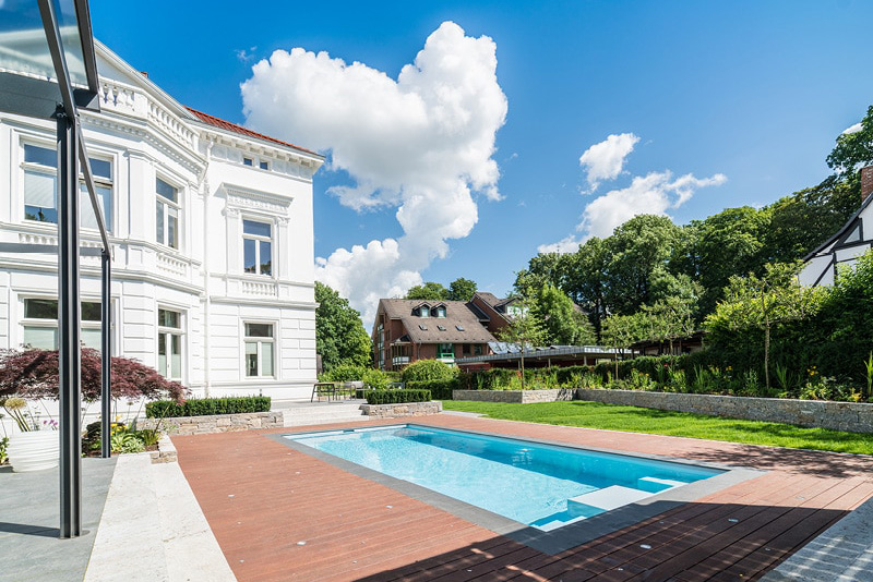 Die wasserberührende Oberfläche besteht aus verschweißten 4 mm starken PVC hart-Platten, auf der Rückseite befindet sich eine GFK-Beschichtung welche zur Stabilisierung dient. Die Herstellung erfolgt in einem Stück, ohne Fugen und Flanschverbindungen, dies garantiert Dichtigkeit und hervorragende Hygieneeigenschaften. PVC-hart in Schwimmbadqualität ist durchgefärbt, UV-stabilisiert, farbecht, weichmacherfrei und cadmiumfrei, der Werkstoff ist beständig gegen alle Schwimmbadwasser, auch bei hohen Wassertemperaturen. Osmose ist physikalisch nicht möglich. Einen sicheren Ein- und Ausstieg ermöglichen rutschhemmend beschichtete Treppenanlagen mit einer farblich abgesetzten Trittkennzeichnung.
