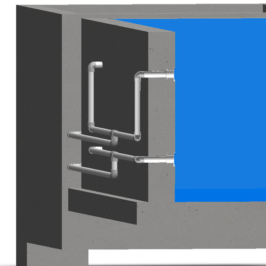 • Um die Einlaufdüse in der Beckenwand zu befestigen werden Wanddurchführungen verwendet welchen dann ebenso wie der Skimmer mit der Filteranlage verbunden werden.