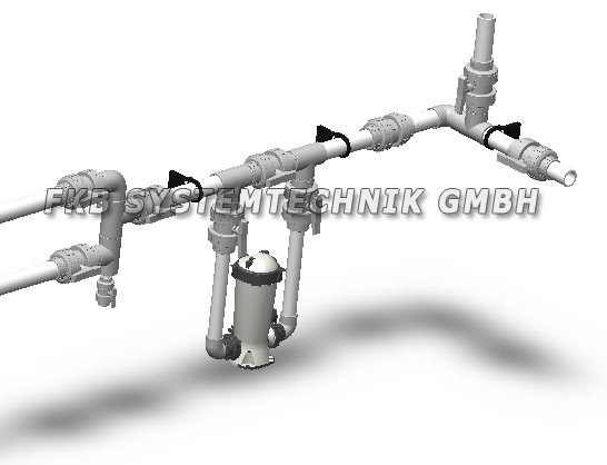 Bei der hier gezeigten Installation handelt es sich um eine Beispielinstallation für private Schwimmbecken mit einer Größe von ca. 3,5x7,0 - 5x10 m. Die Verrohrung ist für 2 Skimmer, 1 Bodenablauf, 1 Bodensaugeranschluss sowie 2 x 2 Einlaufdüsen konzipiert.