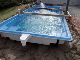 Es empfiehlt sich vor dem Hinterfüllen das Becken an den Längsseiten auszusteifen. Der Wasserstand im Becken wird schrittweise erhöht und dann bis max. zur gleichen Höhe hinterfüllt. Beim Hinterfüllen mit Magerbeton darf nicht verdichtet oder gerüttelt werden und muss umlaufend gleichmäßig gefüllt werden.