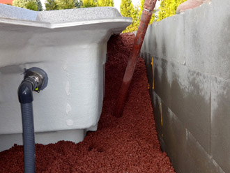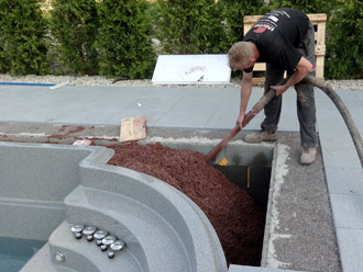 Die Hinterfüllung mit Thermotec bietet gegenüber dem Magerbeton einen wesentlichen Vorteil. Es schützt das Becken nicht nur vor Verformung, sondern dient zusätzlich der Isolation.