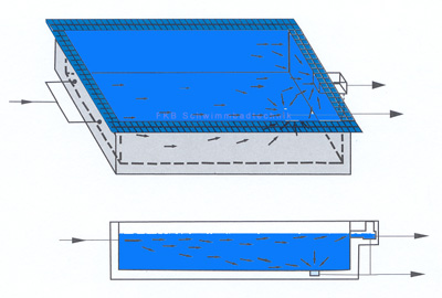 Um eine gleichmäßige Durchströmung des Beckens sicherzustellen, müssen an den Einlaufdüsen gleiche Druckverhältnisse bzw. Einströmgeschwindigkeiten herrschen. Dies ist nach dem Prinzip gleicher Strömungswege in gleich langen Rohrleitungen (Rohrverteilung in Form des sogenannten Hirschgeweihes) bzw. durch den Einsatz regulierbarer oder unterschiedlich dimensionierter Einlaufdüsen möglich.