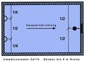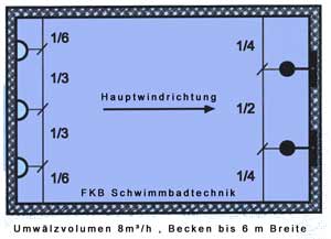 Schon bei der Planung von Freibädern sollte berücksichtigt werden, dass die Strömungsrichtung des Beckenwassers (von den Einlaufdüsen in Richtung Skimmer) immer der Hauptwindrichtung entspricht. Dadurch wird die Wasserbewegung an der Oberfläche in Richtung Skimmer auf natürliche Weise vom Wind unterstützt.