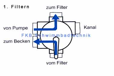 Sobald der Druck auf Ihrem Manometer um 0,3 bar angestiegen ist, muss eine "Rückspülung" durchgeführt werden. Sollte der Manometerdruck im Betrieb nicht ansteigen, (z.B. bei Hallenbädern mit geringer Schmutzbelastung) wird eine einmal wöchentliche "Rückspülung" empfohlen. |
