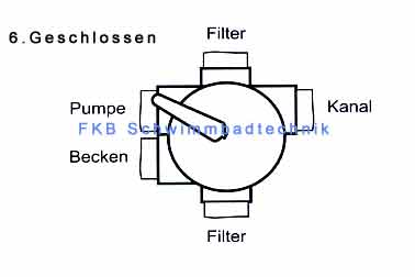 Durch die Funktion "Geschlossen" wird der Wasserdurchlauf von der Pumpe zum Filter unterbrochen. Diese Funktion dient dazu, den Haarfangkorb der Pumpe zu öffnen oder um eventuelle Reparaturarbeiten durchführen zu können. Sollte Ihre Pumpe unterhalb des Wasserspiegels stehen, schließen Sie bitte zusätzlich alle Schieber vom Becken. 1. Pumpe abschalten Achtung: Vor erneuter Inbetriebnahme prüfen, dass das Mehrwege-Ventil nicht mehr auf Stellung "Geschlossen" steht!