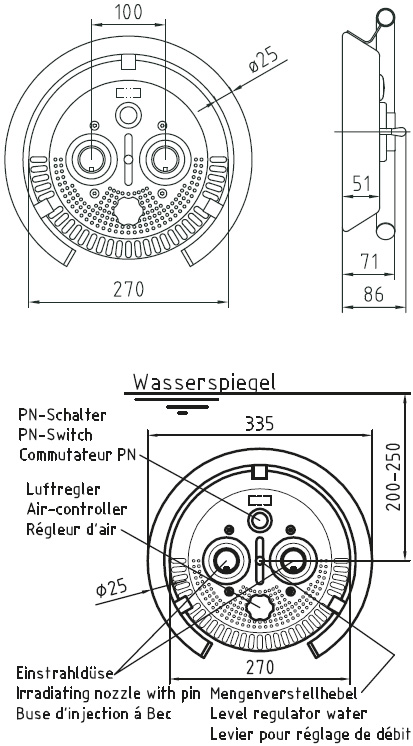 Luft- und Wassermenge können Sie bequem über die vorderen Verstellhebel stufenlos regeln. - Wie erfolgt die Bedienung?
