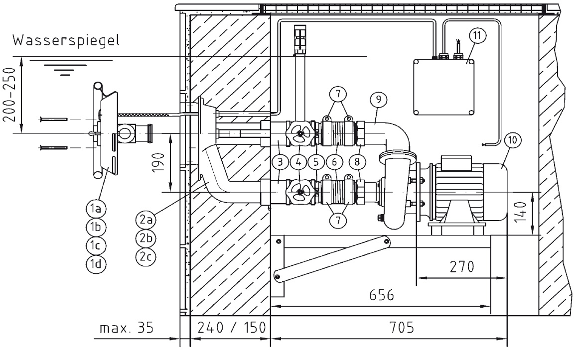 | Mindestmaß Pumpenschacht: 80 cm × 50 cm, mind. 75 cm unter Wasserspiegel. Be- & Entlüftung sowie Entwässerung erforderlich. | |
