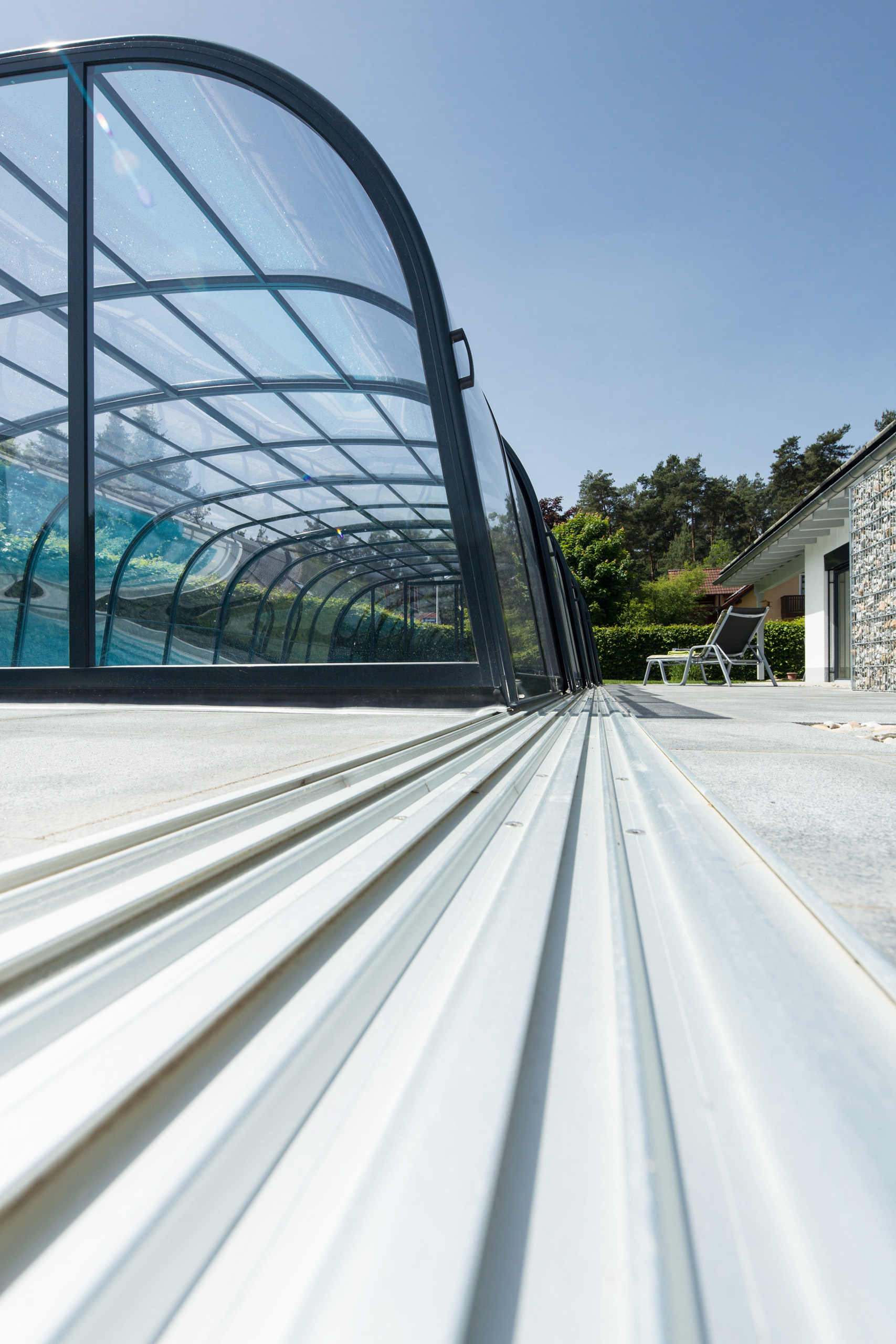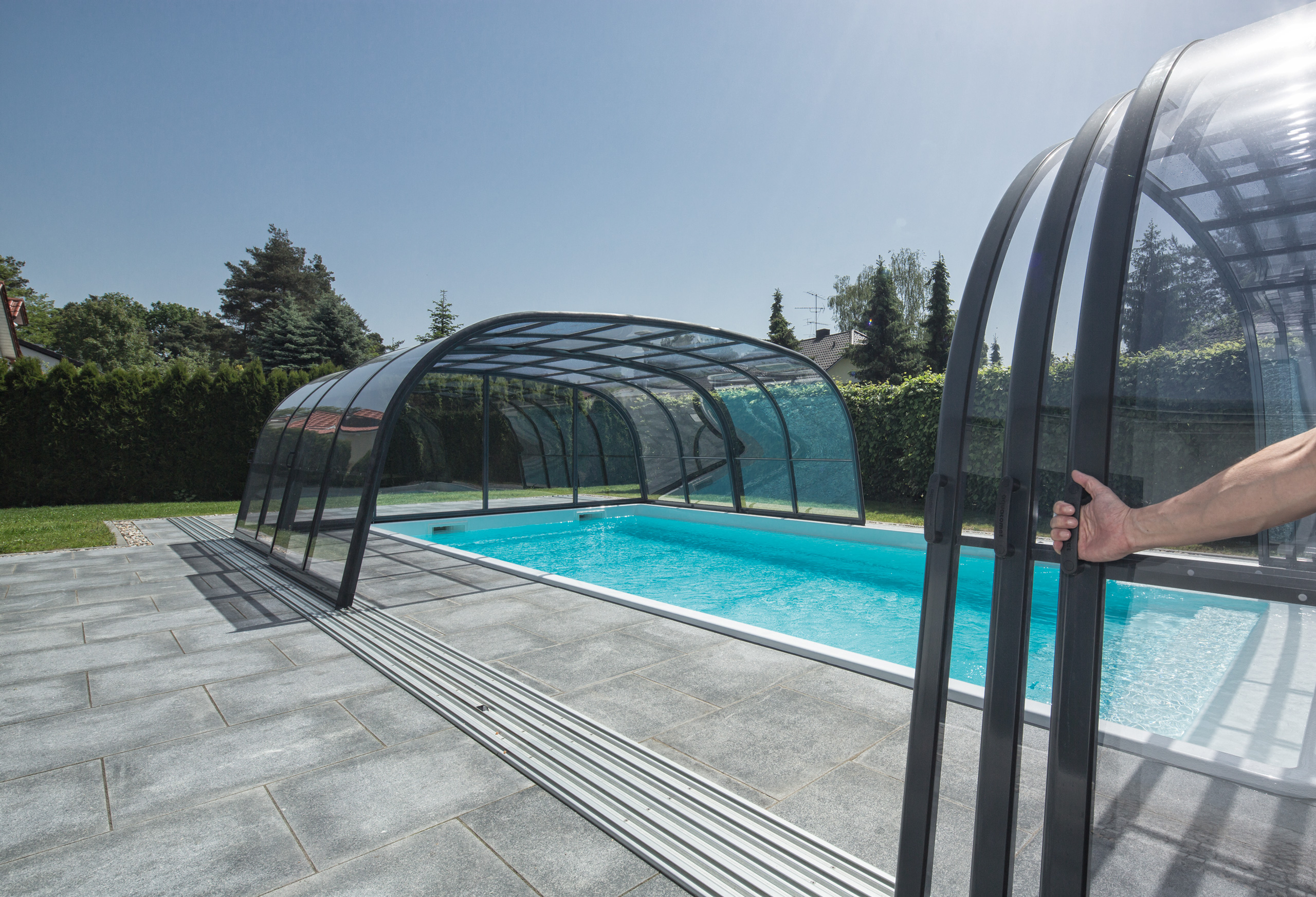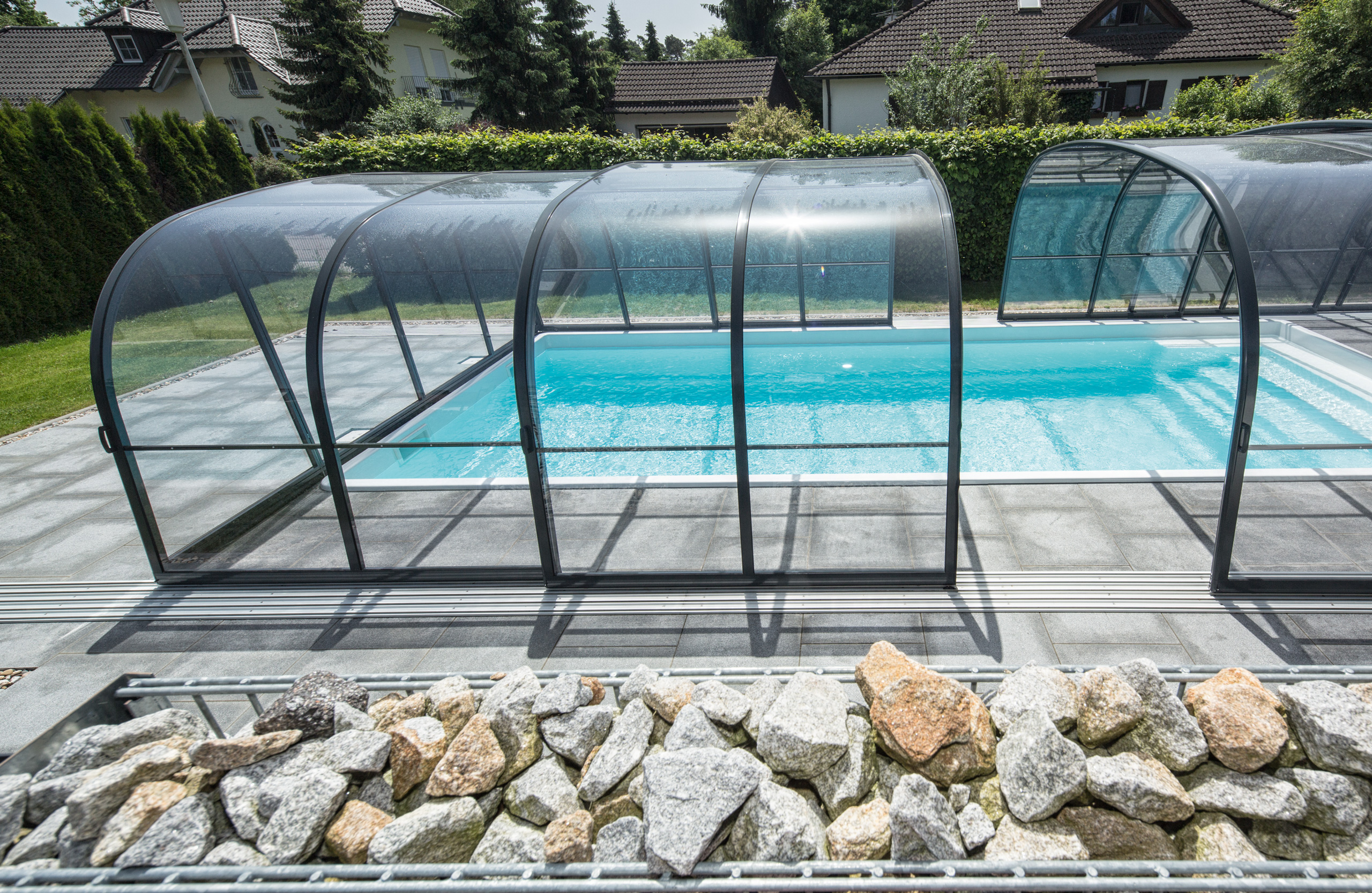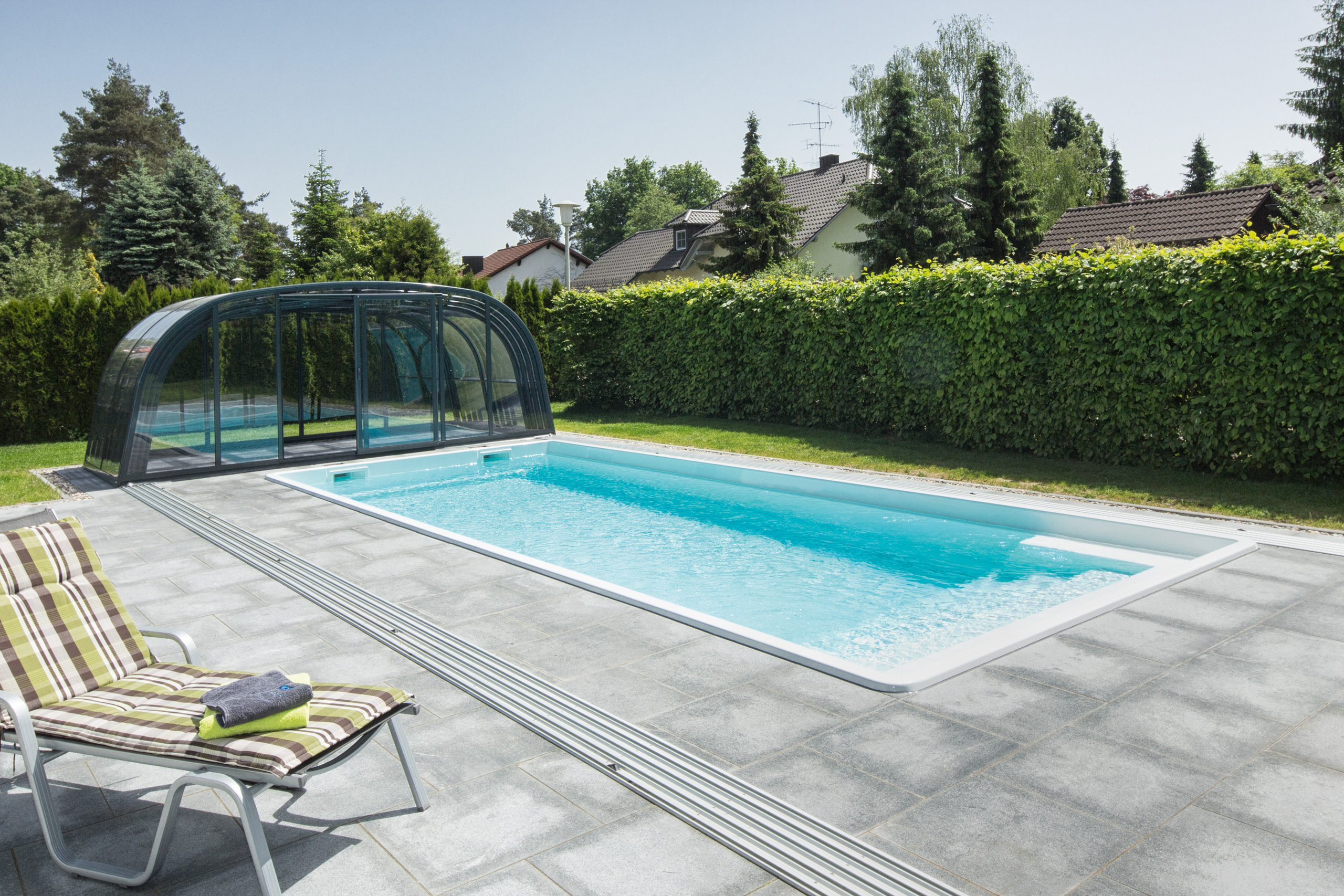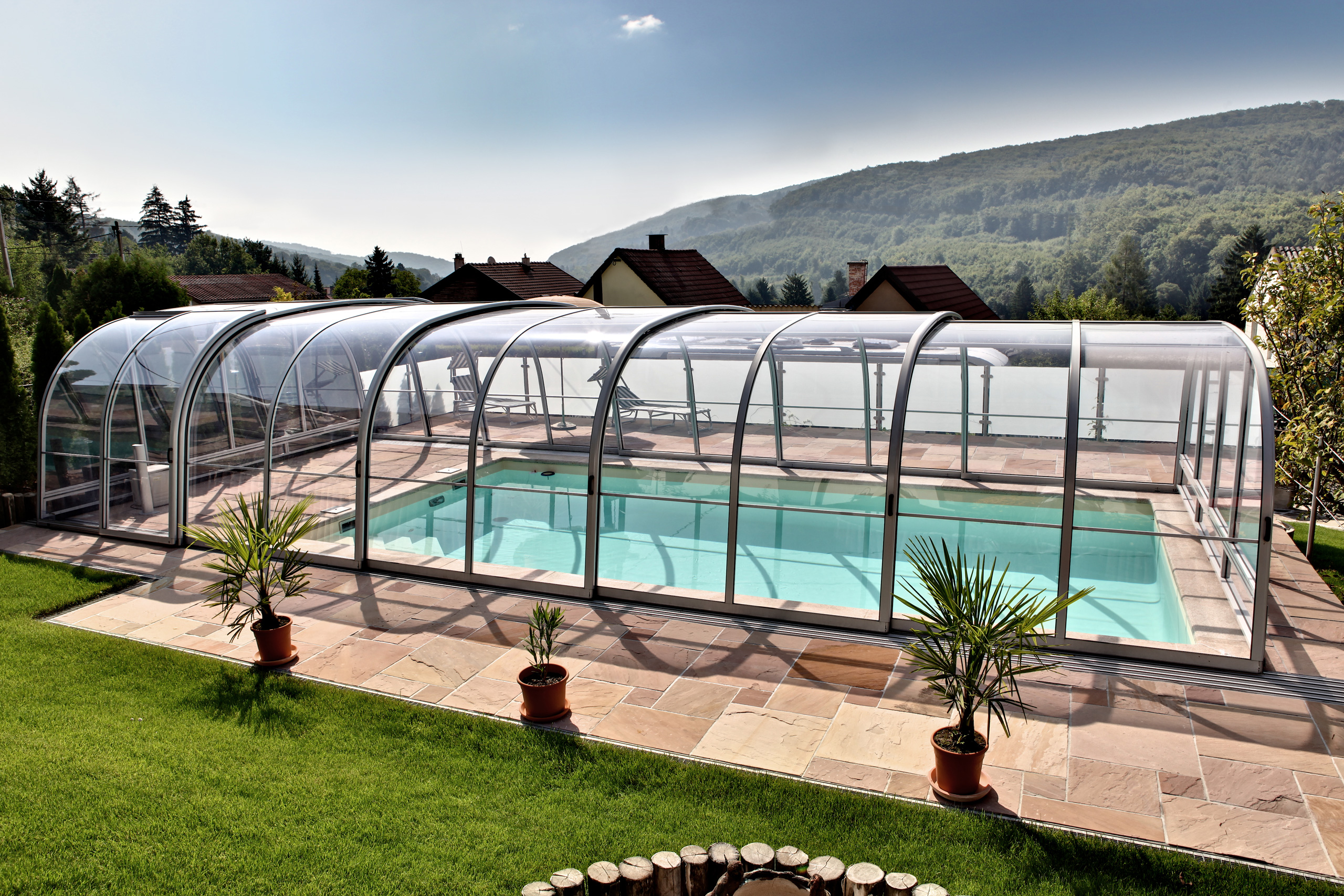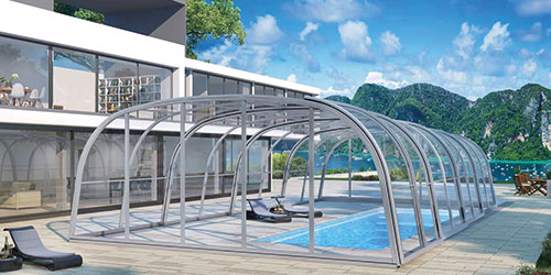 Die Poolüberdachung hilft effektiv das Wasser zu erwärmen und reduziert somit den Wärmeverlust und die Heizkosten.