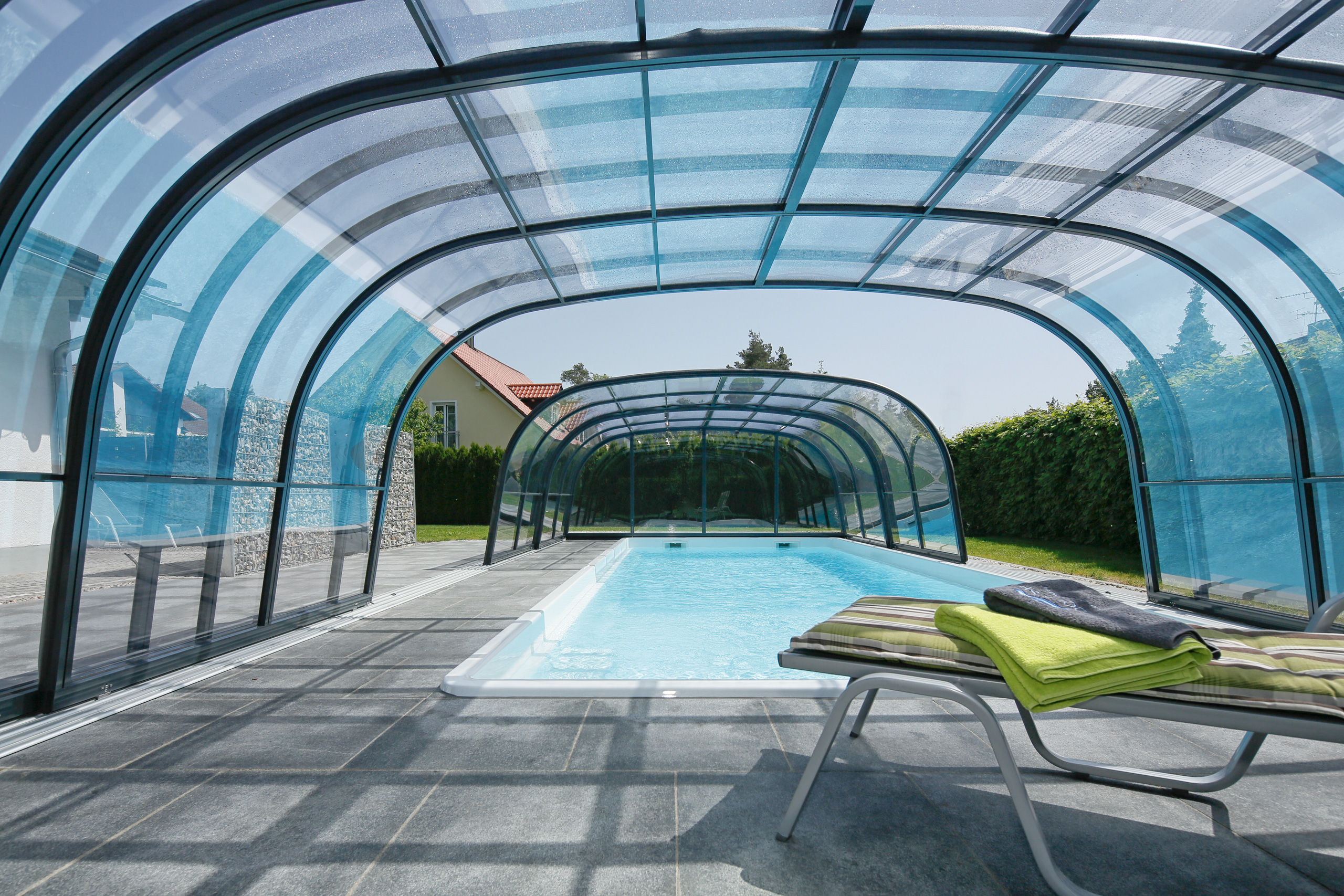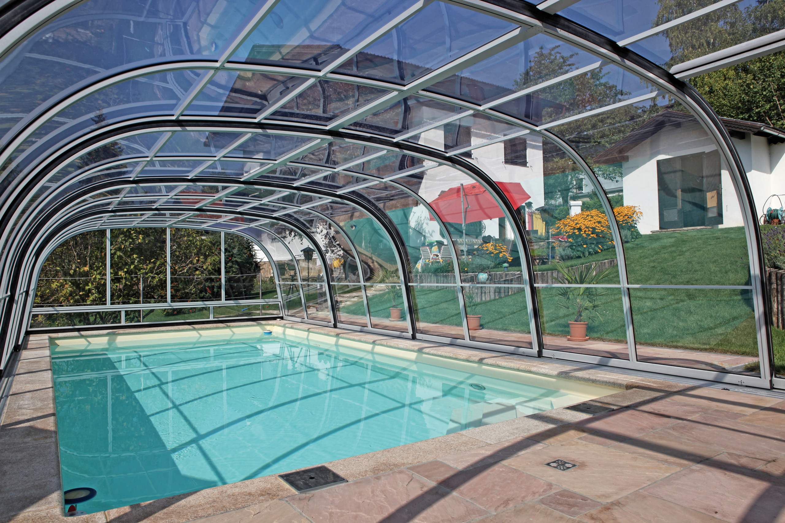 Die Poolüberdachung verlängert Ihre Badesaison um mehrere Monate und ermöglicht Badevergnügen in einer wohltemperierten Umgebung auch bei schlechtem Wetter.