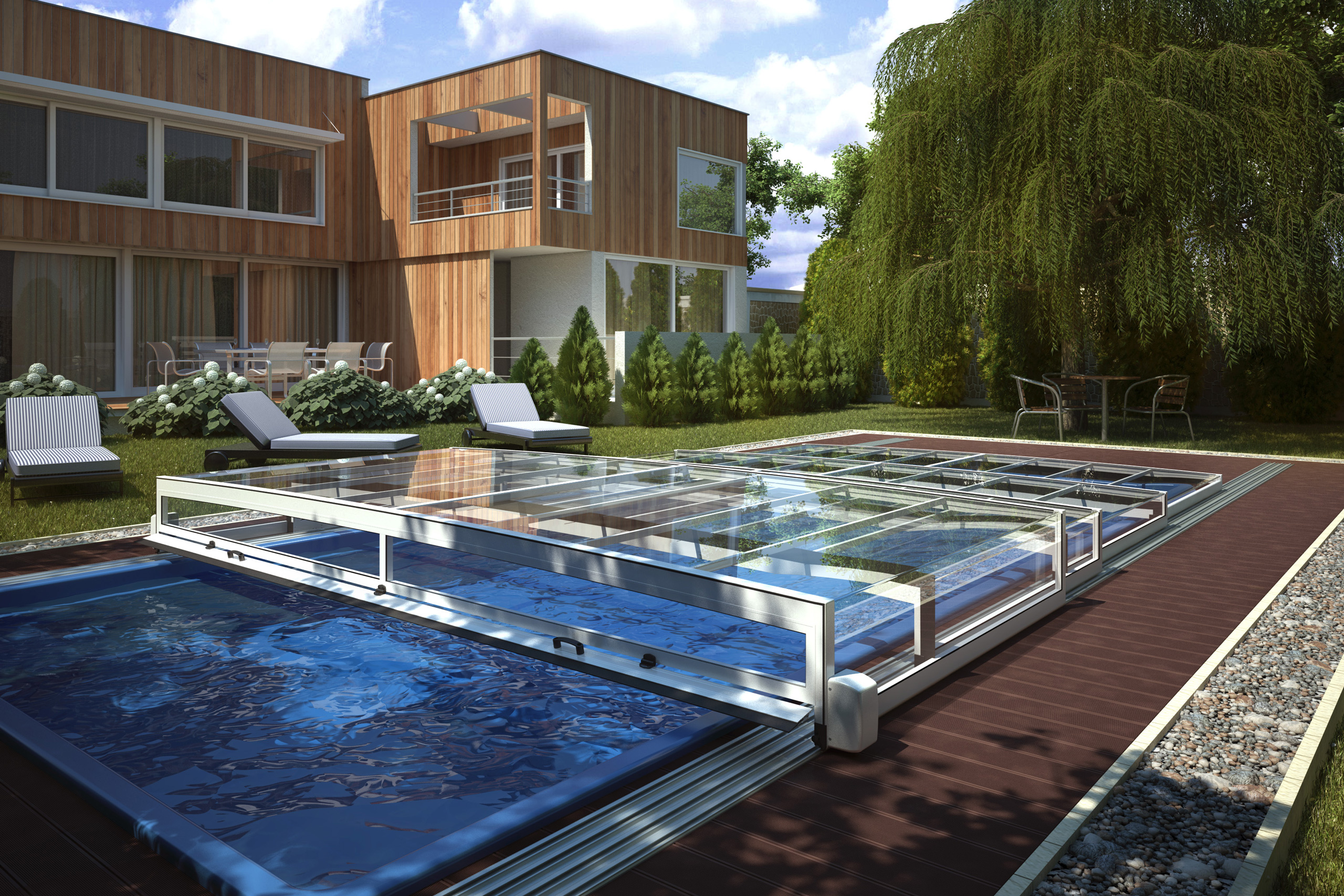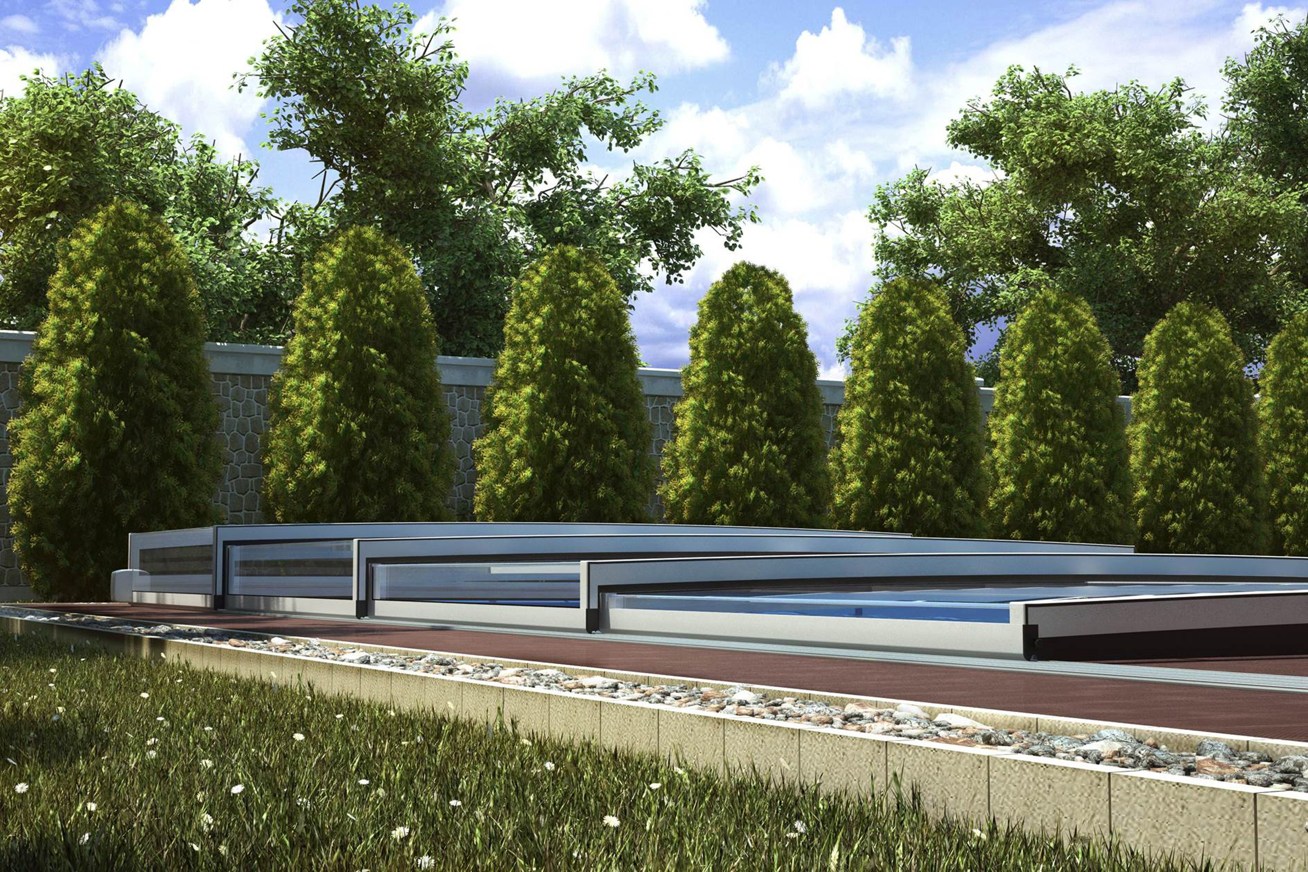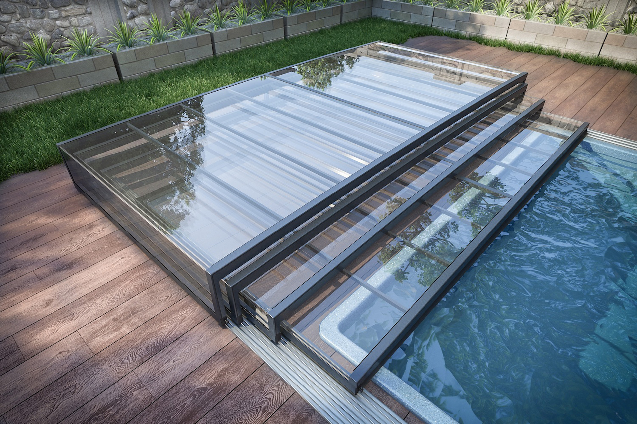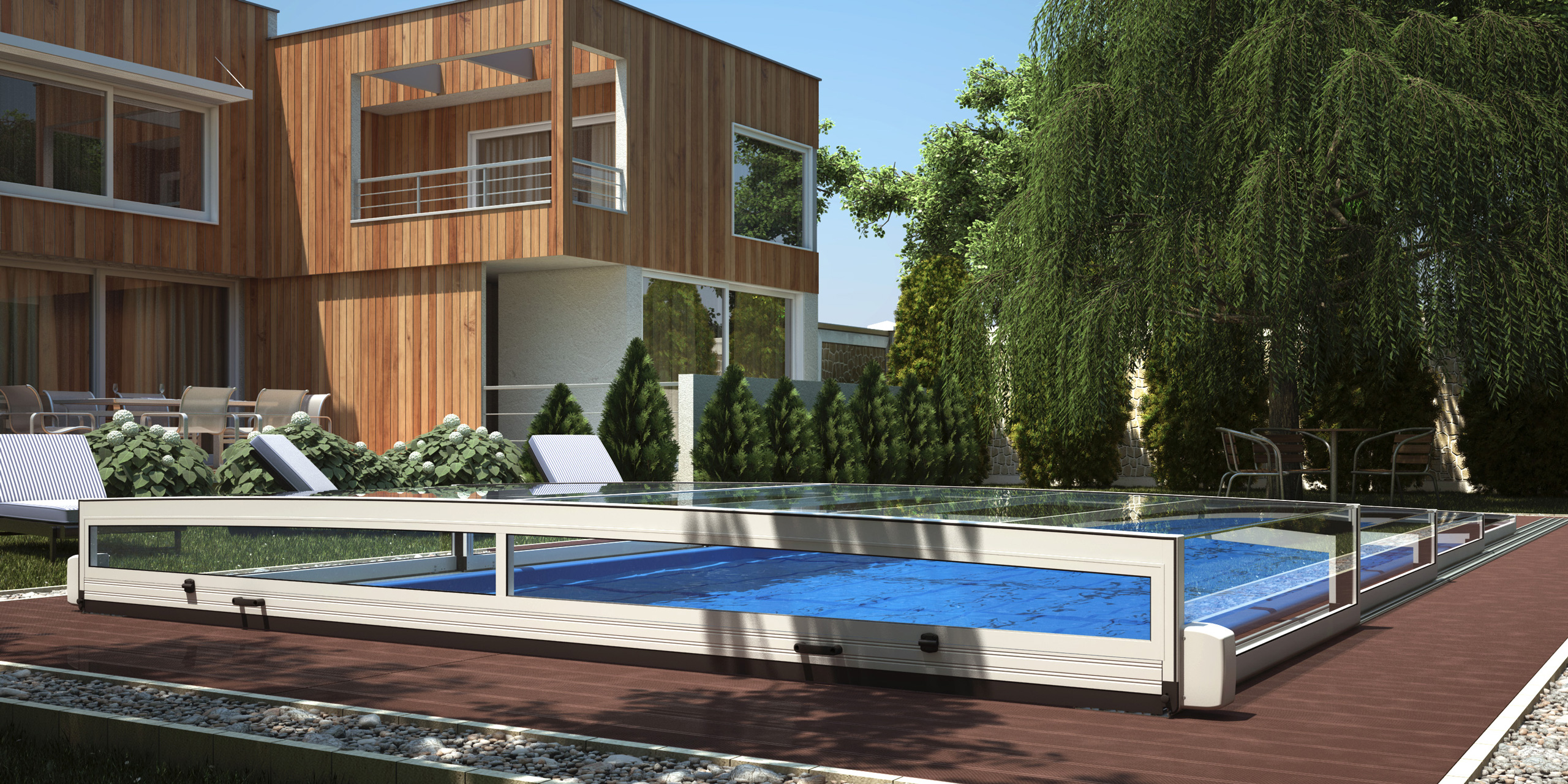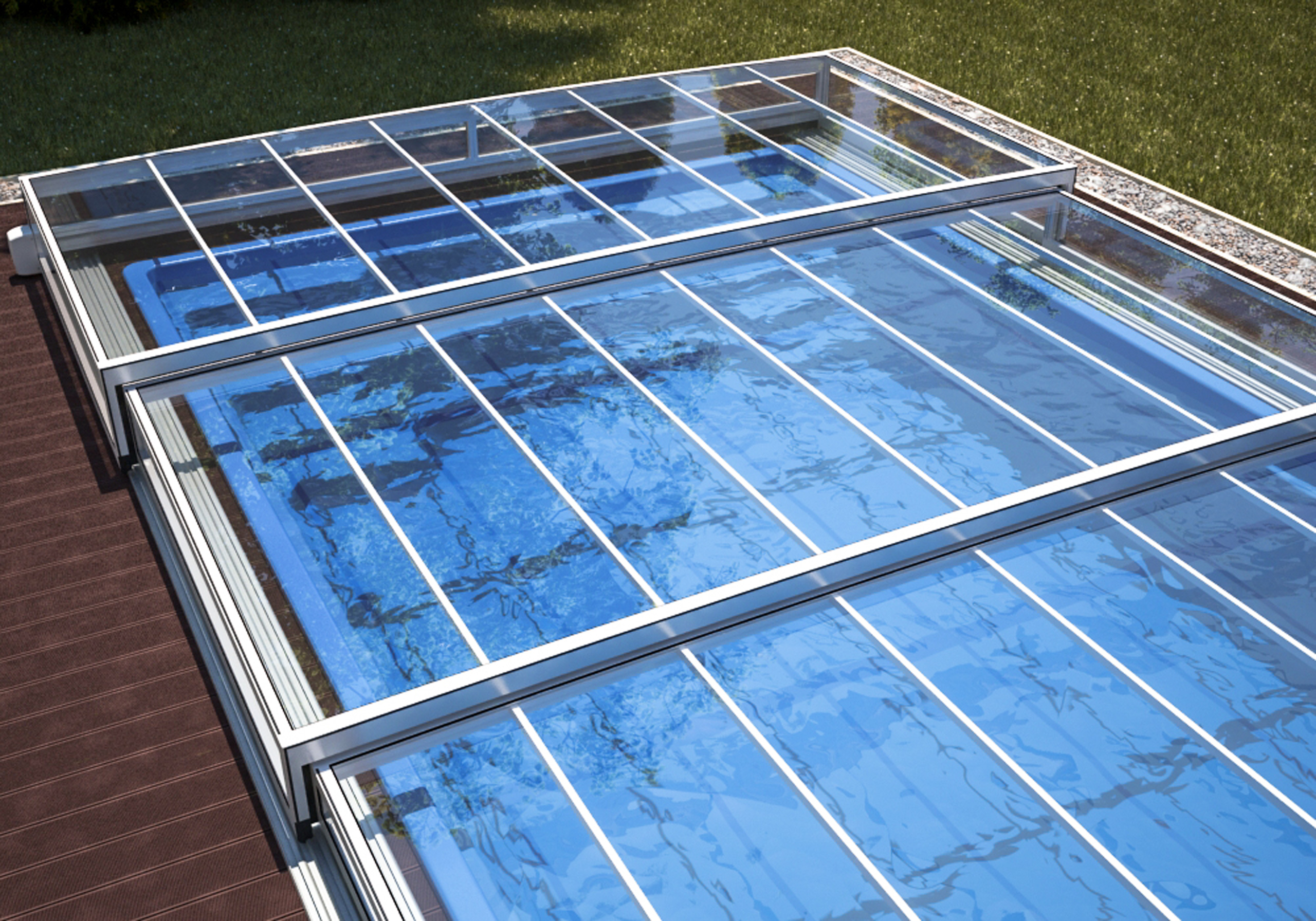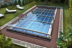 Die novacomet Horizon Pool-Überdachung passt sich dank ihrer superflachen Bauart und der eckigen Form hervorragend in die Umgebung ein und ist damit eine ideale Ergänzung zum modernen Baustil unserer heutigen Zeit. Die maximale Höhe der novacomet Horizon beträgt auch bei vier Segmenten nur 56 cm und ist damit eine Besonderheit am Markt.
