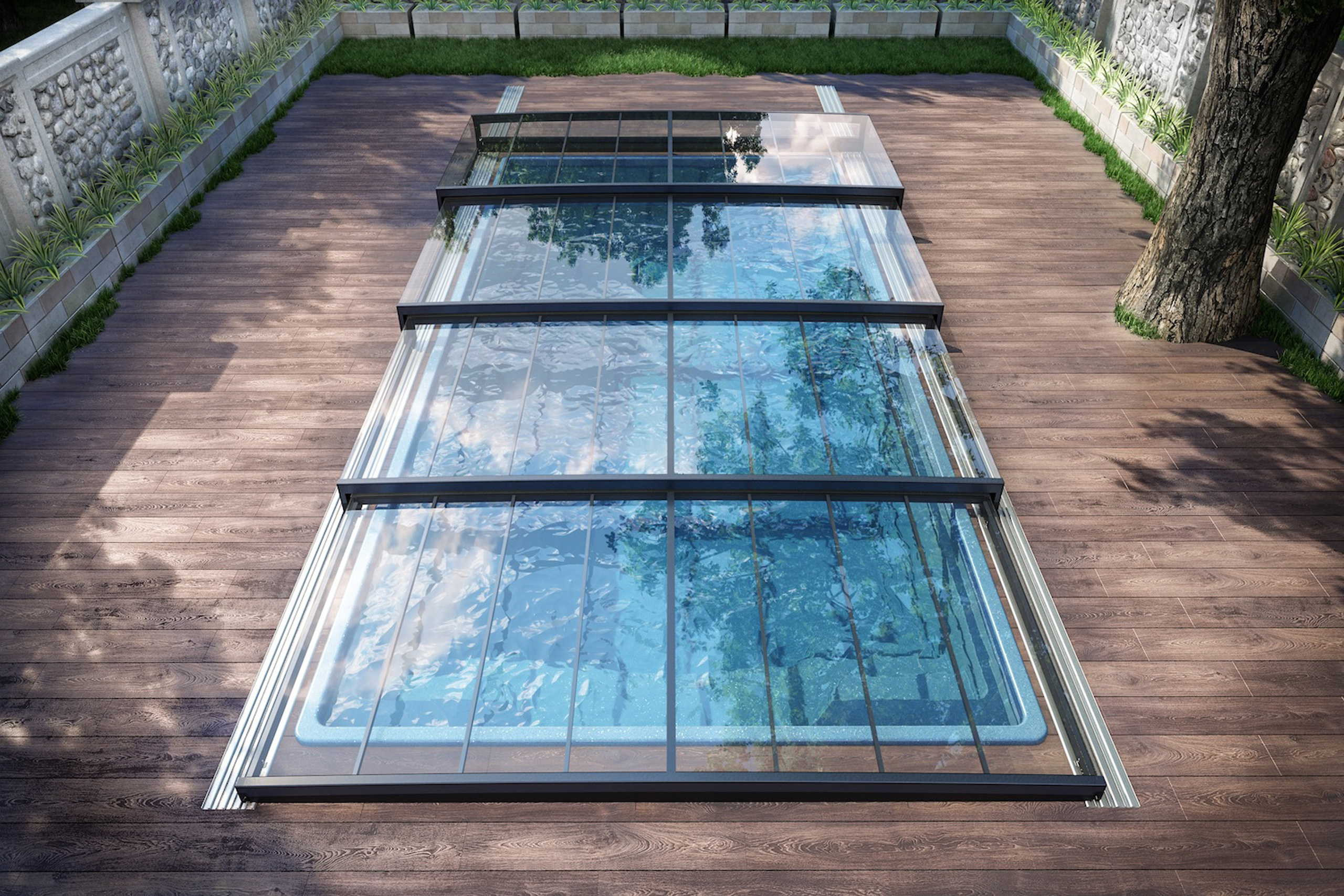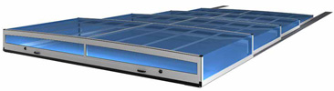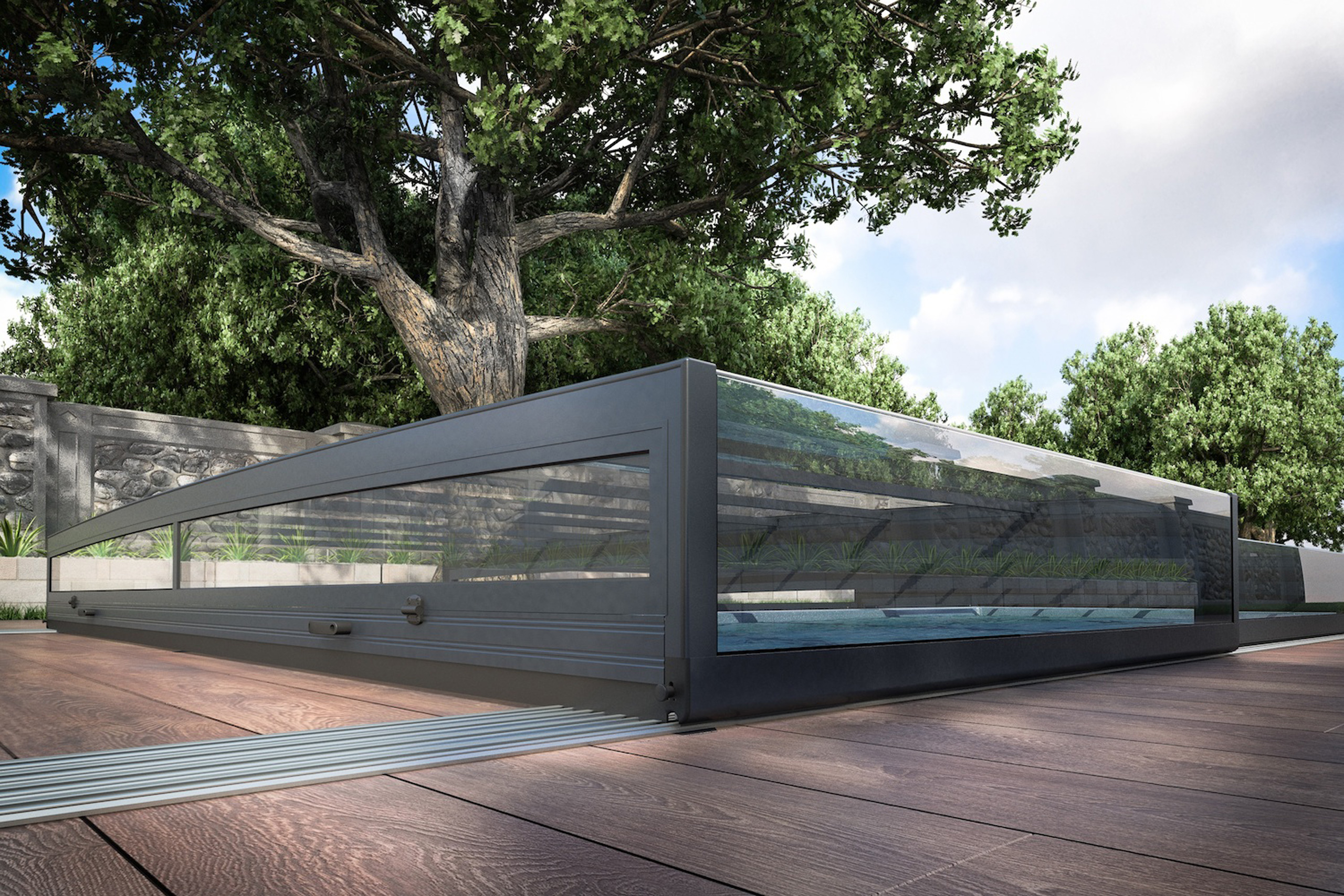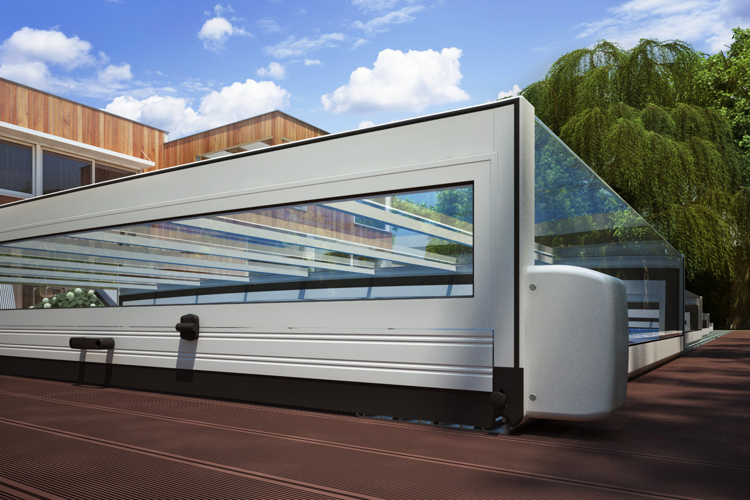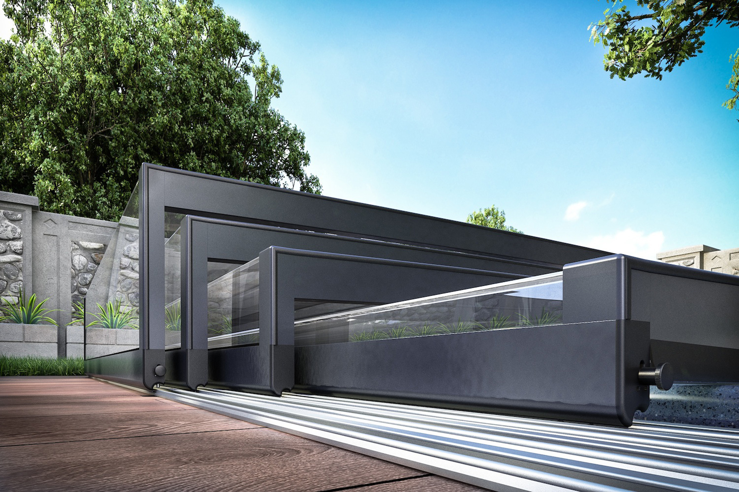 Horizon wird mit einer 12 mm superflachen Schienenbahn von novacomet geliefert und verfügt über eine intelligente Arretierung wodurch die Segmente automatisch einander öffnen und schließen. Das ermöglicht auch eine motorisierte Bewegung der Überdachung mit Solarpanel und Fernbedienung.