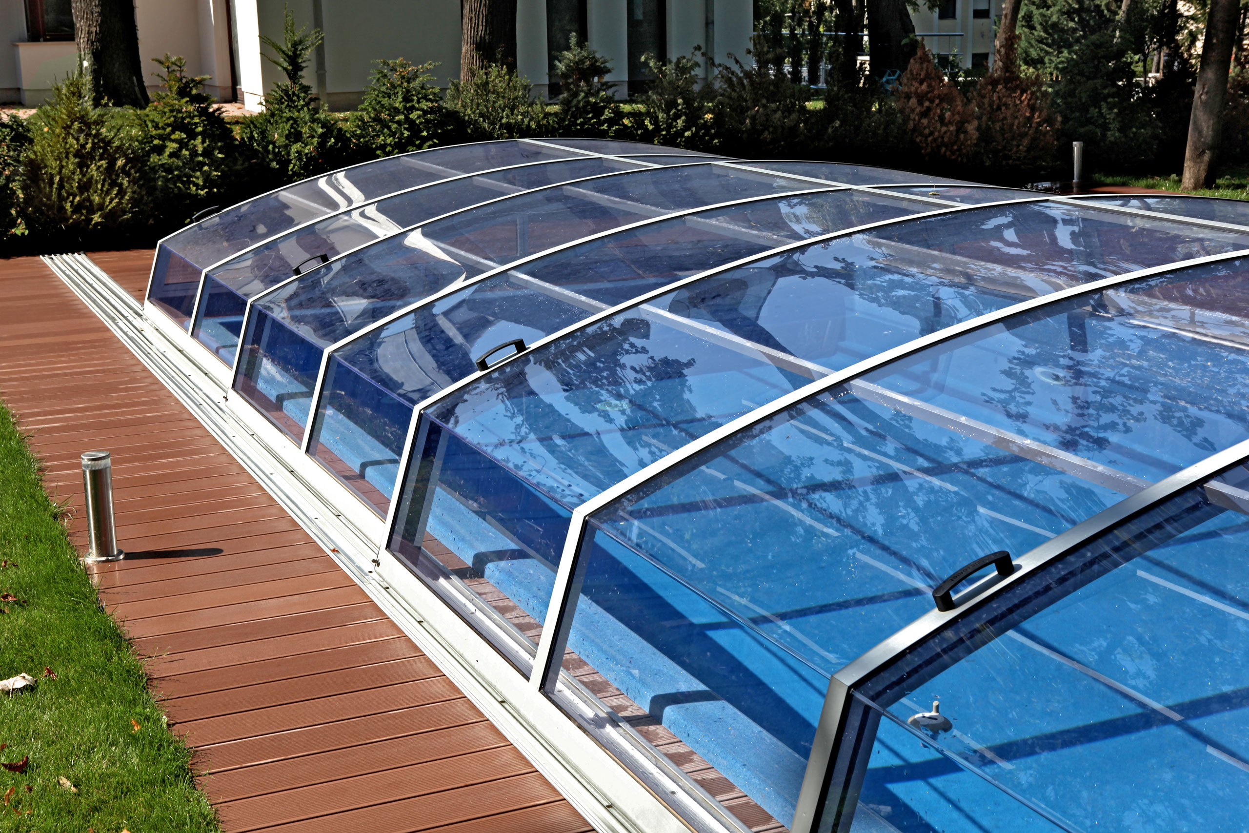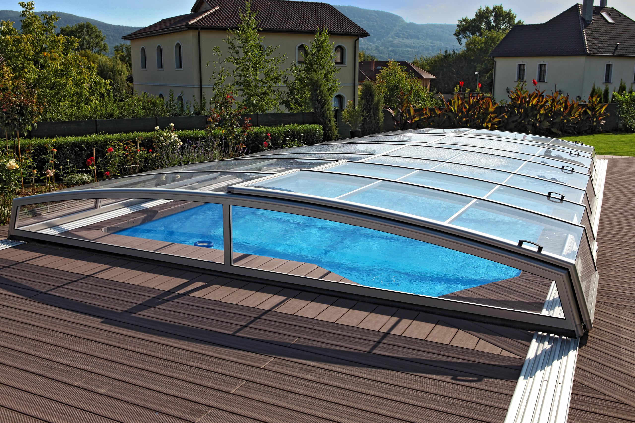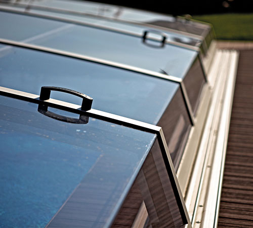 Die Poolüberdachung hilft effektiv das Wasser zu erwärmen und reduziert somit den Wärmeverlust und die Heizkosten.