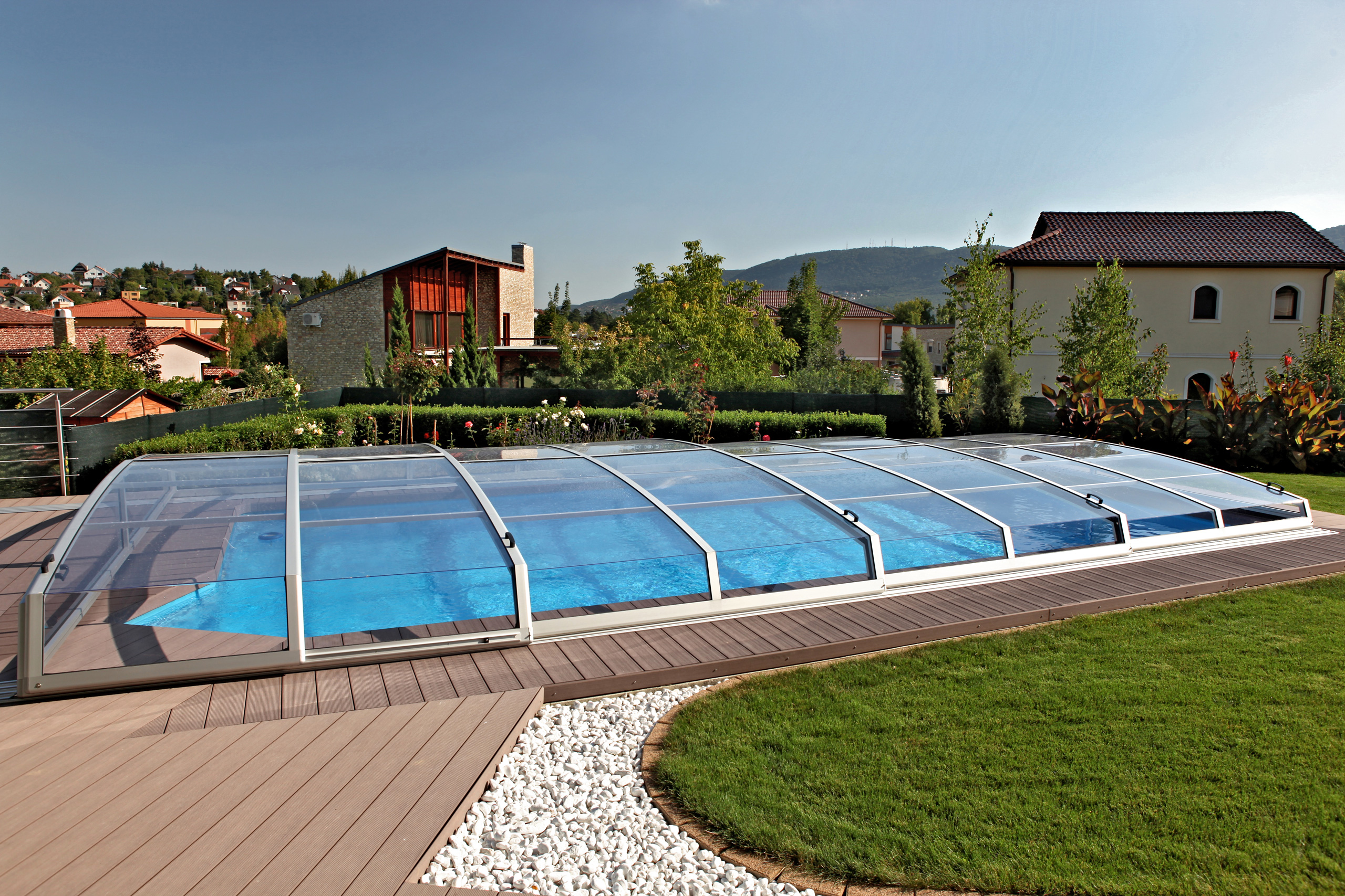 Geniessen Sie Ihren Pool in vollen Zügen und das Wetter bleibt draussen. Wir bieten Ihnen vielfältige Poolüberdachungsmodelle in verschiedenen Formen und Farben an. Die Poolüberdachung ist derzeit eine fast unverzichtbare Ergänzung des Pools. Verlängert wesentlich die Badesaison, garantiert Sicherheit für Kinder und Haustiere sowie Schutz vor Verschmutzung. Die Poolüberdachung ist wasserbeständig und benötigt keine besondere Wartung.