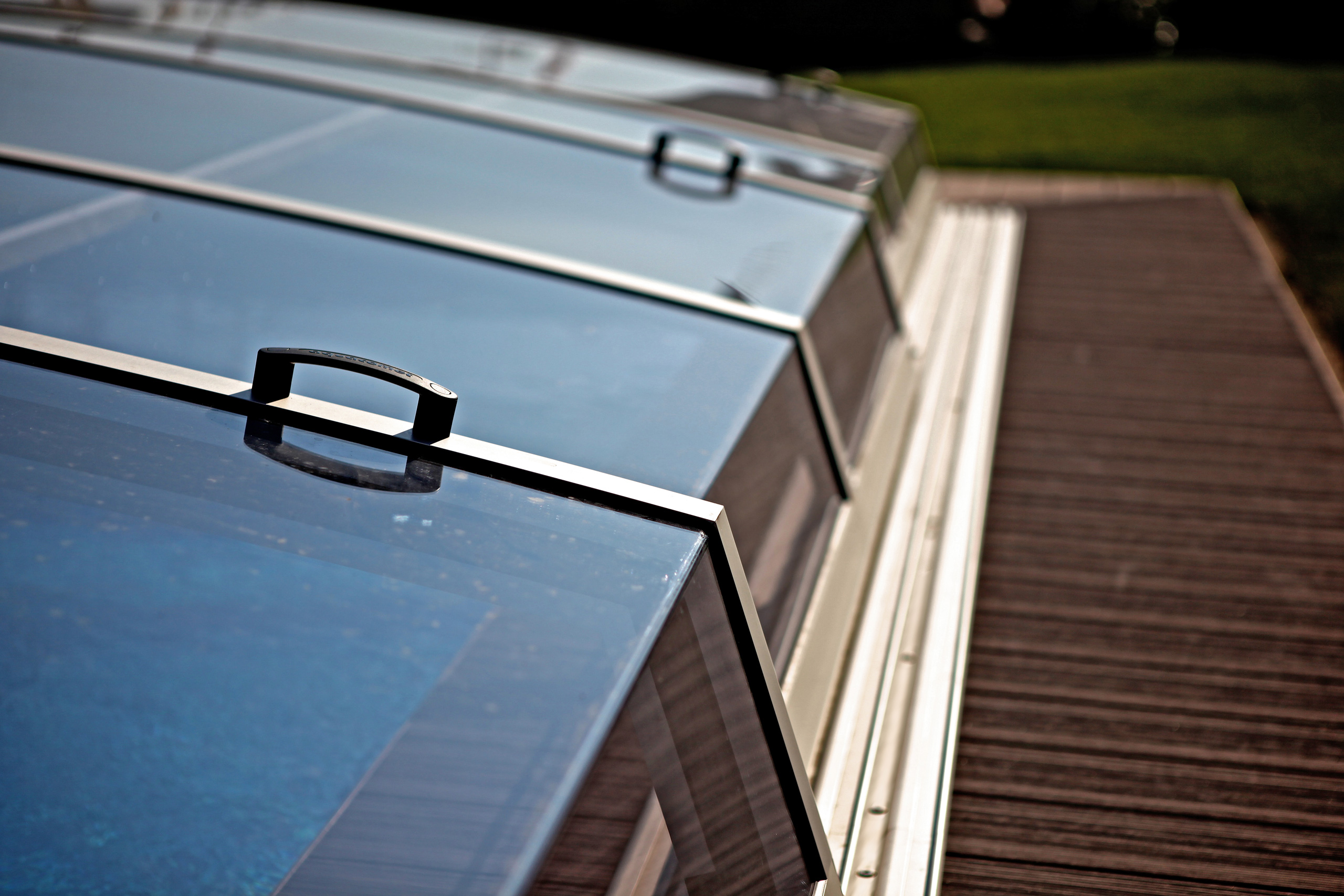 VISUAL FLACH platziert sich dezent mit seiner modernen Trapezform in Ihrem Garten. Dieses Modell wird serienmäßig mit automatischem Arretierungssystem auf einer extraflachen Führungsschiene mit nur 12 mm Höhe geliefert. Eine Verlängerung der Führungsschiene bis zu 2,80 m je Seite, welche zum Freischieben Ihres Schwimmbeckens dient, wird (wenn gewünscht) im Serienumfang mitgeliefert.