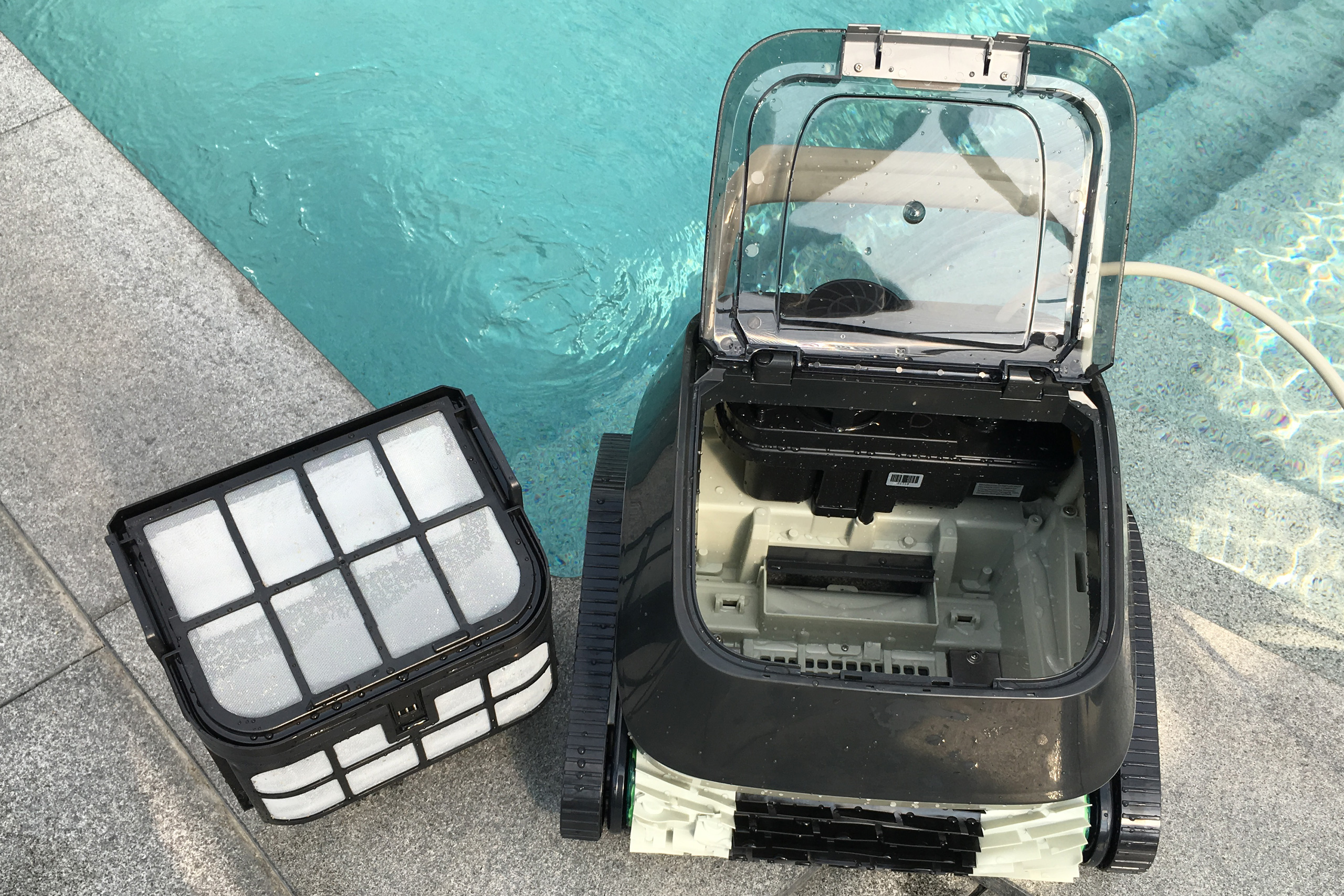 Der Roboter wird mit einem Sammelkorb geliefert. Dieser Sammelkorb mit Filterwänden ist waschbar und kann mit dem beigelegten Einweg-Feinfilter ergänzt werden, wenn sich feine Partikel im Pool befinden.