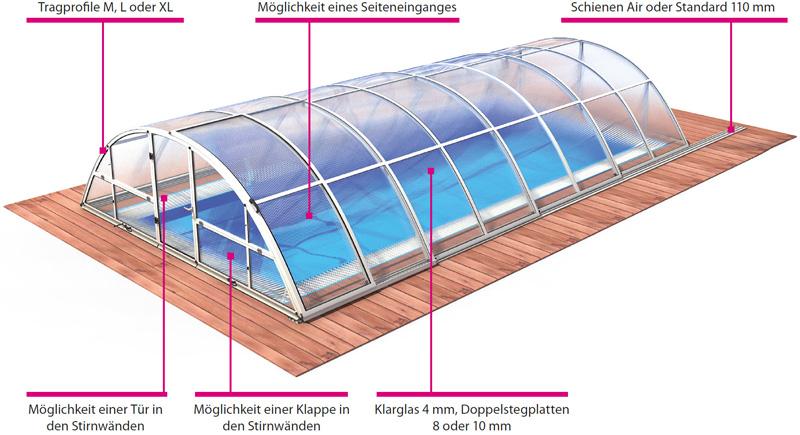 Die halbrunde Schwimmbadüberdachung Schwimmbad-Überdachung Klasik besitzt ein neues Design mit abgerundeten Aluminium Profilen, hierdurch entstehen elegante Kurven und eine höhere Tragfähigkeit, was die Schiebehalle flacher werden lässt. Flache Laufschienen und die abgerundeten Aluminiumprofile mit eloxierter Oberfläche geben der Überdachung ein besonders hochwertiges Aussehen.