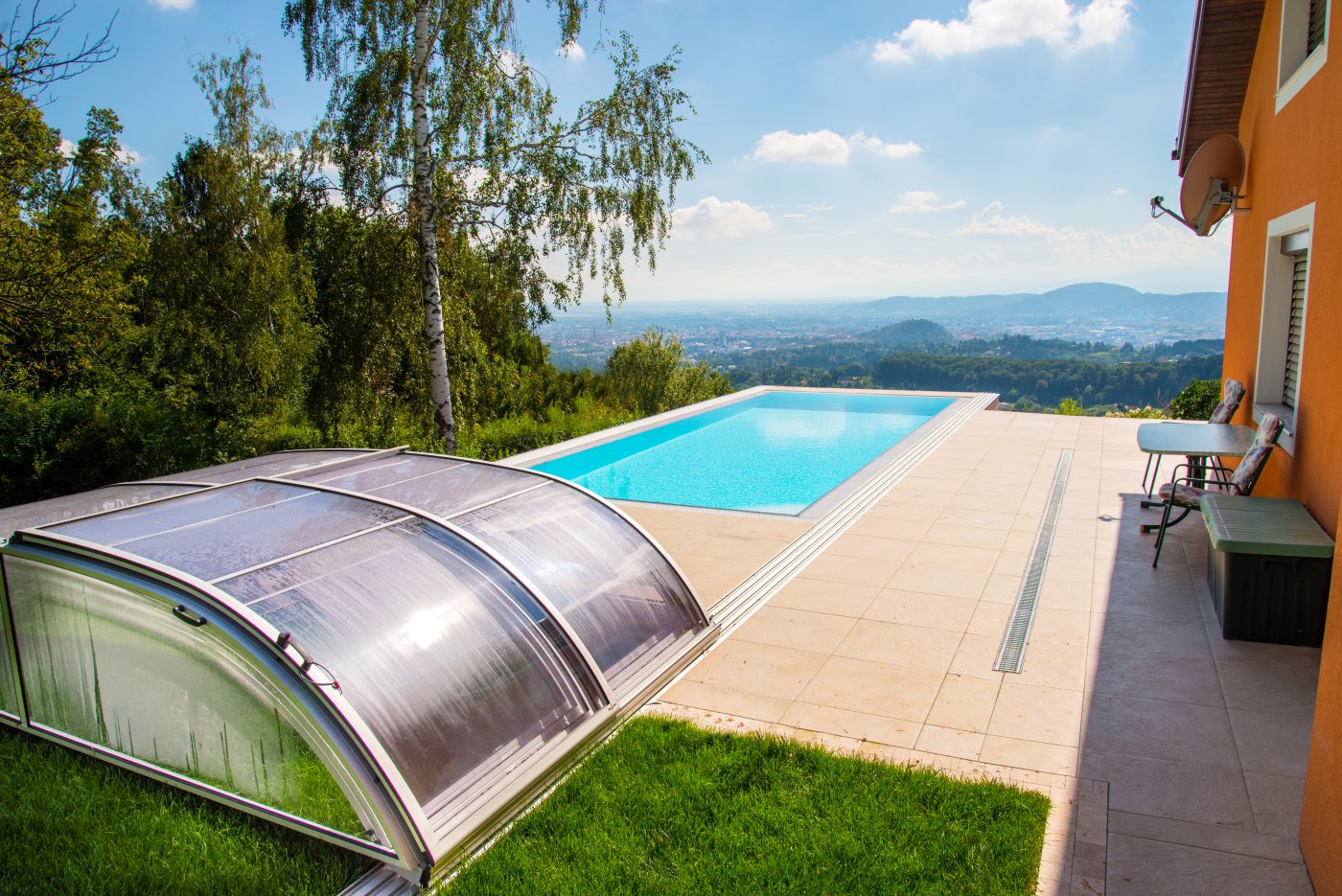 Die Poolüberdachung verlängert Ihre Badesaison um mehrere Monate und ermöglicht Badevergnügen in einer wohltemperierten Umgebung auch bei schlechtem Wetter.