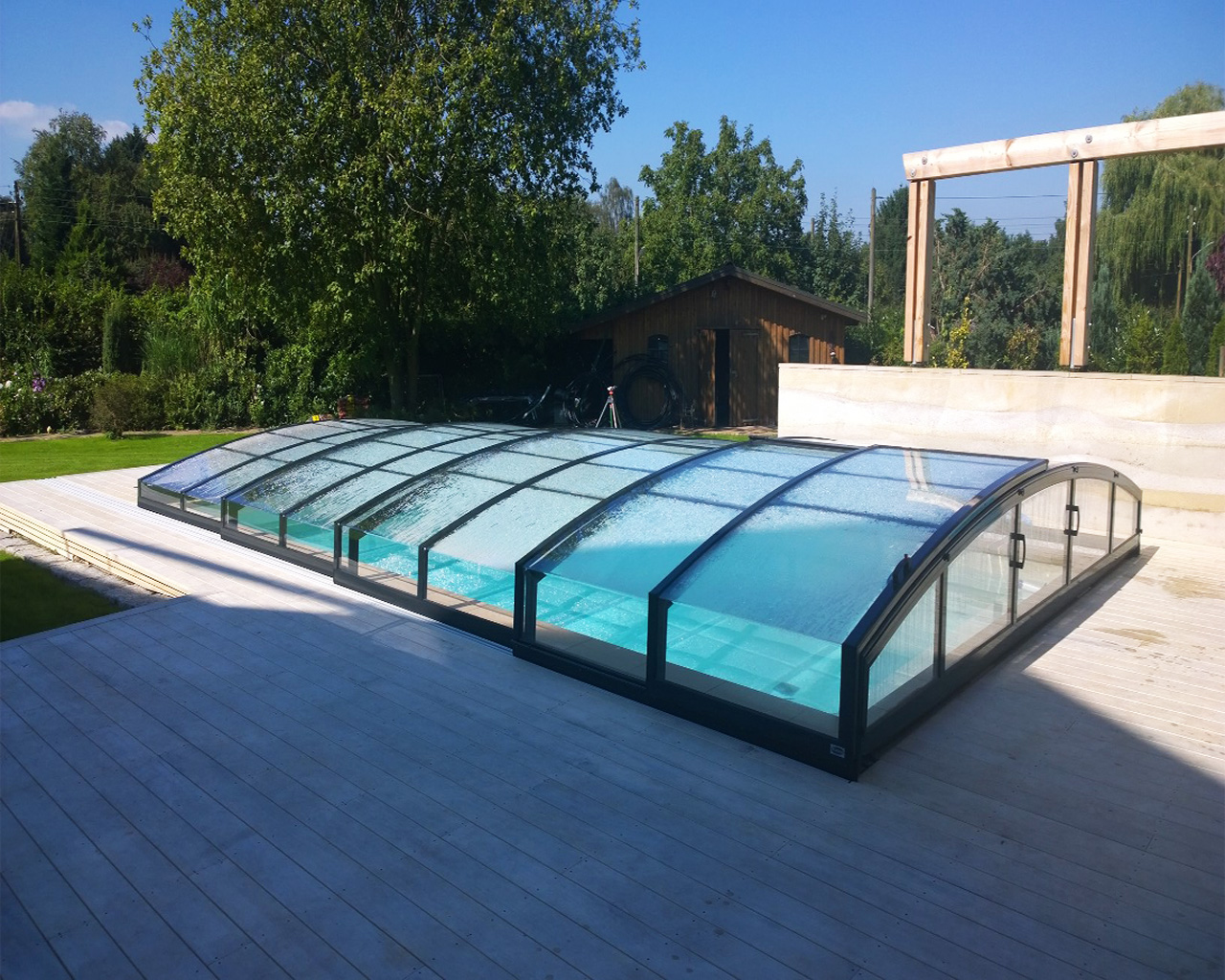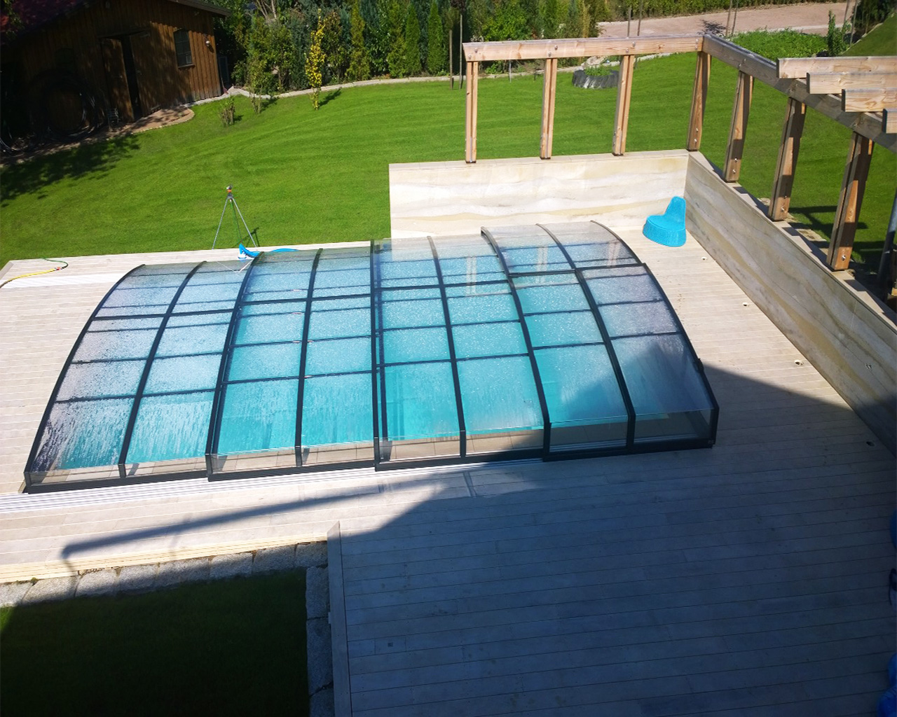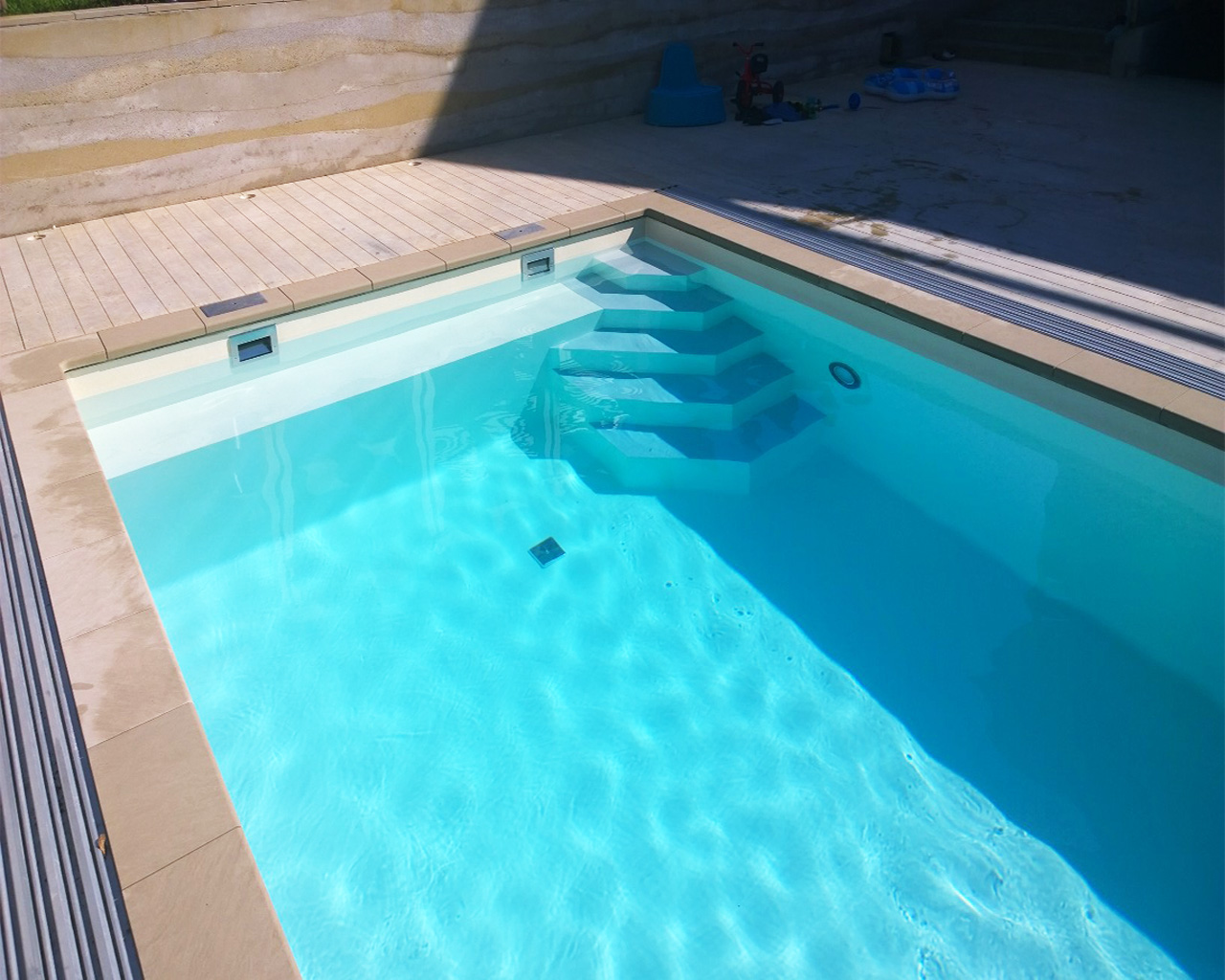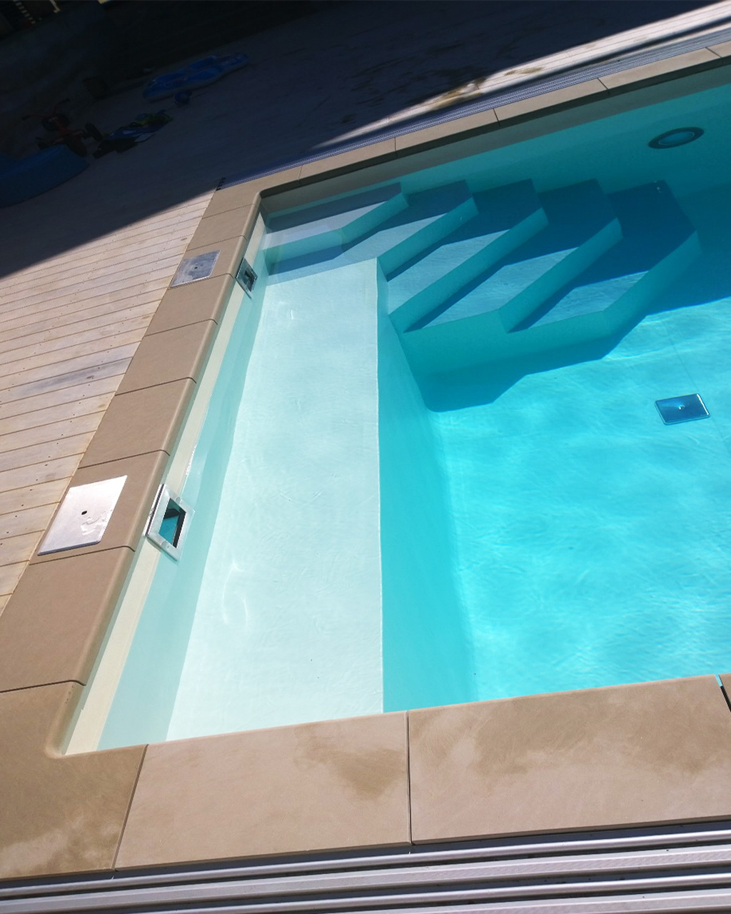 Betonbecken mit den Maßen 4 x 8 x 1,55 m mit Ecktreppe, Sitzbank und Schiebehalle Casablanca Infinity B