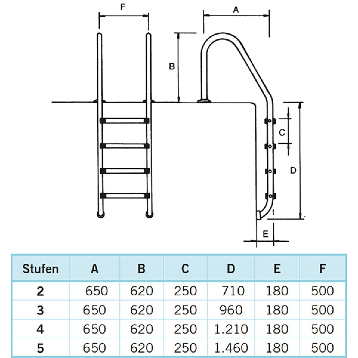 - Hinweis: Nicht für Salzwasser geeignet. Für Salzwasser werden Poolleitern aus Titan empfohlen.