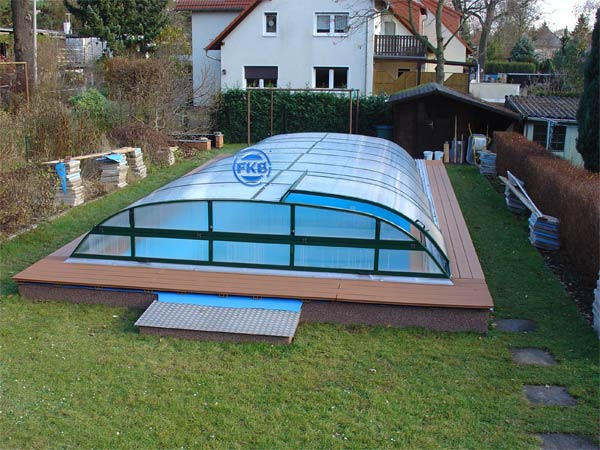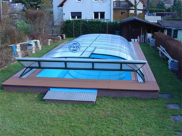 Die Schwimmbad - Überdachung ist für den Sommerbetrieb vorgesehen und besteht aus einzelnen, teleskopisch angeordneten Modulen und kann daher untereinander verschoben werden. Die Bewegung der Module wird durch die an den Längsseiten der Überdachung angeordnete Schienenanlage ermöglicht. Die einzelnen Überdachungen unterscheiden sich voneinander insbesondere mit der Kuppelform (Elementform), die durch die Form der Trägerprofile bestimmt ist. Aus den unterschiedlichen Elementformen ergeben sich daher unterschiedliche Eigenschaften der einzelnen Überdachungstypen.