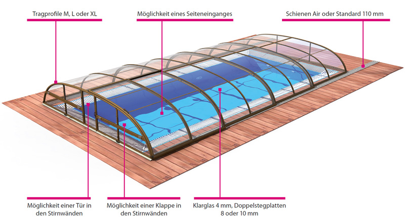 Die Schwimmbad-Überdachung Dallas ist zur Abdeckung von Schwimmbadanlagen oder anderen Anlagen vorgesehen.