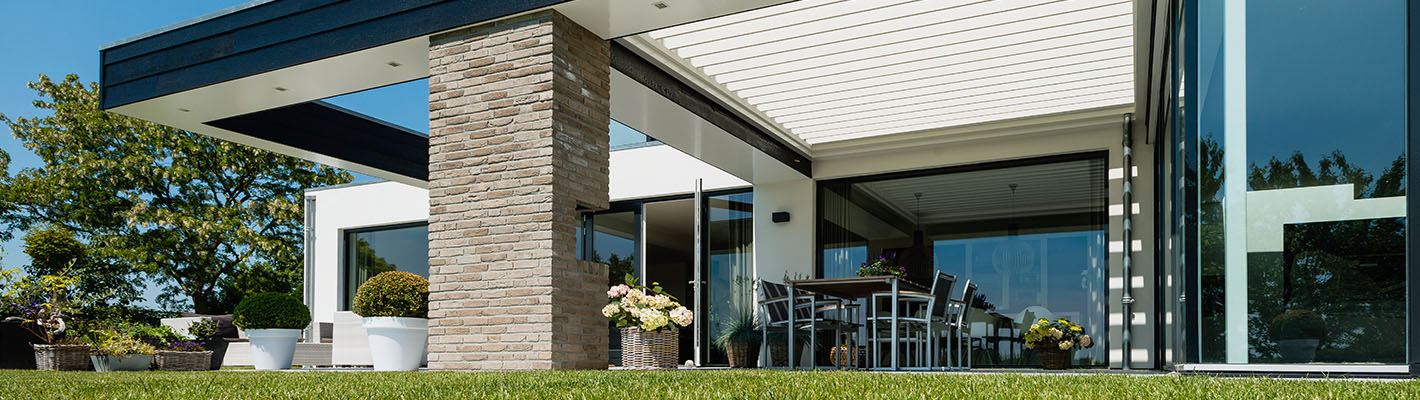 Horizontales wasserabweisendes Sonnenschutzdach mit kippbaren Lamellen, das perfekt in neue oder bestehende Gebäude integriert werden kann.