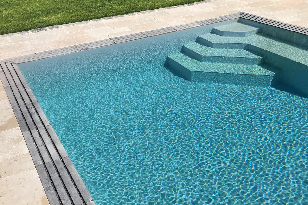 Überlaufbecken Overflow Stone EVO 8,0x3,5x1,35m mit 2 Ecktreppen Achteck und Sitzbänke